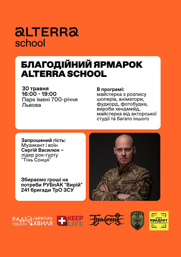 30 травня Alterra School запрошує львів’ян на благодійний ярмарок, що відбудеться у Парку імені 700-річчя Львова з 16:00 до 19:00. Усі зібрані кошти будуть передані на потреби РУБпАК “Вирій” 241 бригади територіальної оборони ЗСУ.